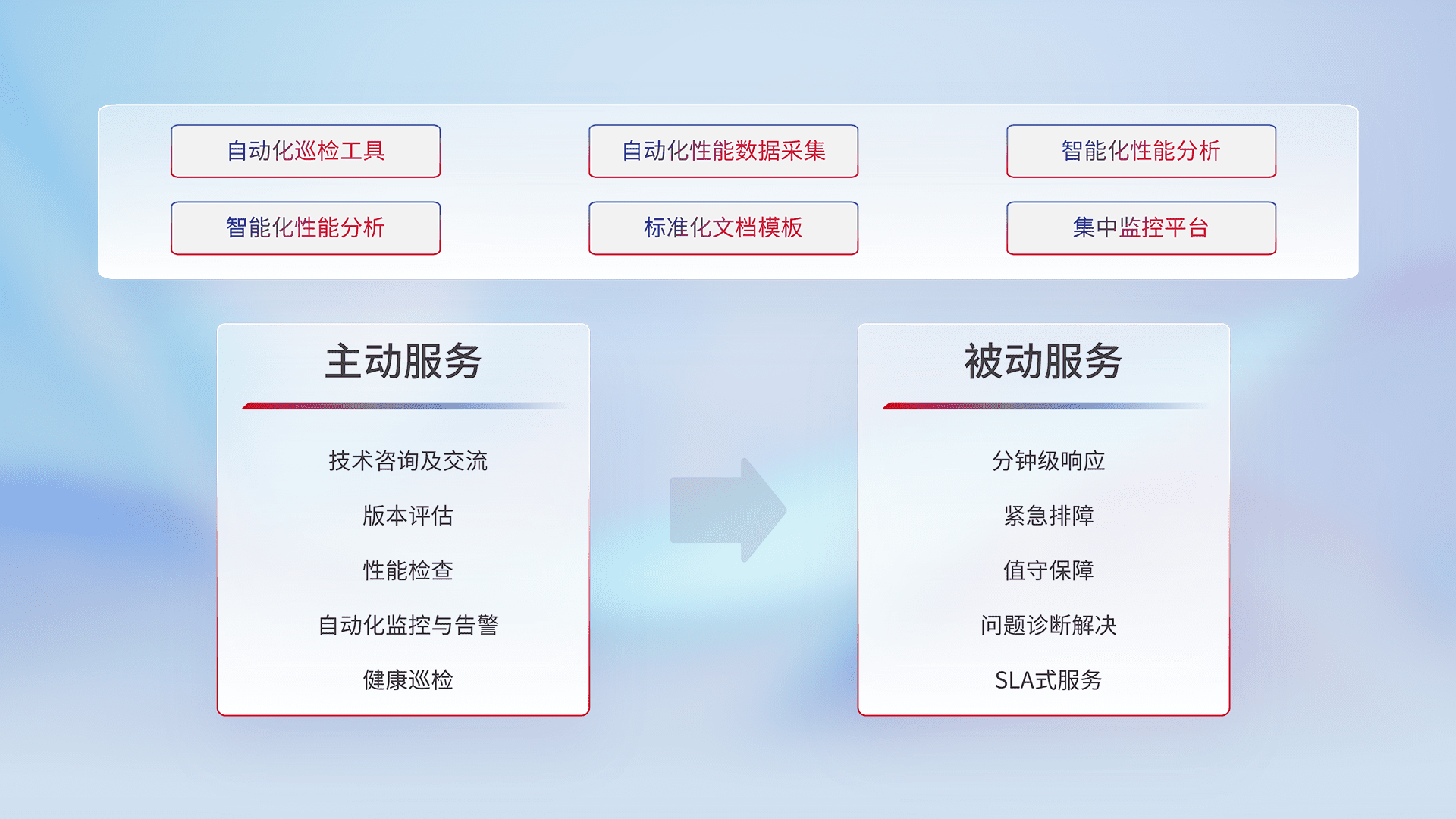智能化工具和标准化文档,,保障服务质量,,,提供主动服务(包含技术咨询、、、版本评估、、、、性能检查、、自动化监控与告警、、、、健康巡检)和被动服务包含(分钟级响应、、、、紧急排障、、、、值守保障、、问题诊断解决、、SLA服务)。。。